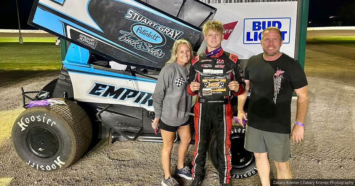 Jackson Gray started on the front row and never looked back as he scored his first Sprint Kings Sprint Car Series feature win Friday night at the Fayette County Speedway.